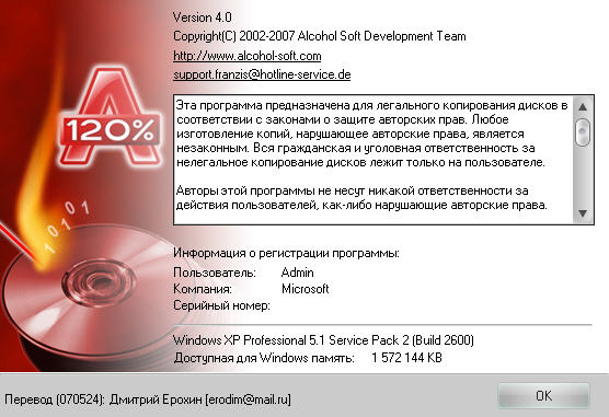 Alcohol 120%- эмулятор CD/DVD-дисков. Программа создает на жестком диске ПК пользователя образ диска с данными, аудио или видео информацией, а затем предоставляет доступ к этим данным другим программам так, словно искомый диск находится в приводе. Alcohol 120% поддерживает работу со многими форматами CD/DVD, имеет возможность работы с 31 образом одновременно, обеспечивает несоизмеримо большую (по сравнению с CD) скорость передачи данных между приложением и образом диска. Имеется поддержка русского языка.