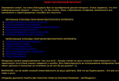 ЛЕГАЛЬНЫЕ СПОСОБЫ ПОЛУЧЕНИЯ БЕСПЛАТНОГО ИНТЕРНЕТА: Интернет за деньги: учимся экономить. Получи халявный инет,легально! Выделенная линия, оплачиваемая организациями. Условно-бесплатный интернет. Стань провайдером!!! пусть платят тебе. Настройся на бесплатный интернет!