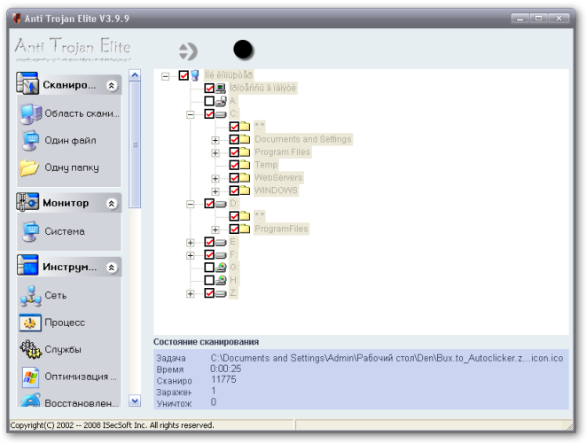 Anti Trojan Elite - программа для очистки компьютера от троянов, кейлогеров и пр. Anti Trojan Elite сканирует не только жесткий диск (включая архивы ZIP CAB), но и смотрит на то, какие процессы запущены. Также она располагает менеджером сетевых процессов, при помощи которого можно определить, где запущен нежелательный процесс. Кроме этого, вы можете просмотреть ключи и значения реестра и удалить подозрительные, починить Internet Explorer, оптимизировать работу Windows вообще. Программа имеет опцию отката.