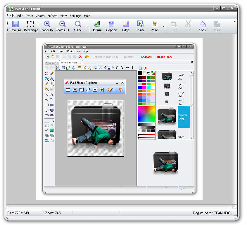 FastStone Capture представляет собой довольно мощное, но в то же время простое средство для захвата снимков с рабочего стола Windows. Позволяет захватывать как отдельные элементы, окна, части рабочего пространства, так и полный экран (поддерживается прокрутка страниц). Оснащена небольшой панелью для манипуляций с изображениями. Кроме того, имеются в наличии такие элементы, как экранная лупа, пипетка и линейка, что делает программу еще более универсальной.