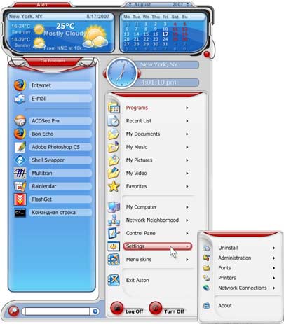 Aston 2 Menu - это заменитель стандартного меню Windows с улучшенной функциональностью и новыми возможностями. Все без исключения элементы Aston 2 Menu могут менять свой внешний вид при помощи различных «шкур» и анимации, что добавляет им привлекательности.