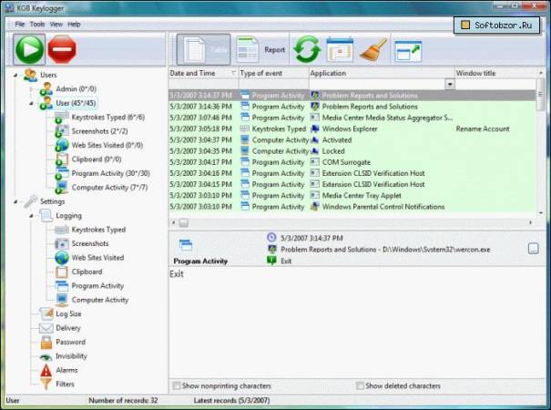 KGB Key Logger - бесплатная версия программы шпиона. Записывает все нажатия на клавиатуре при этом надежно скрывая свое присутствие. Записывает даже нажатия клавиш во время игры, а также протоколирует выполняемые операции.