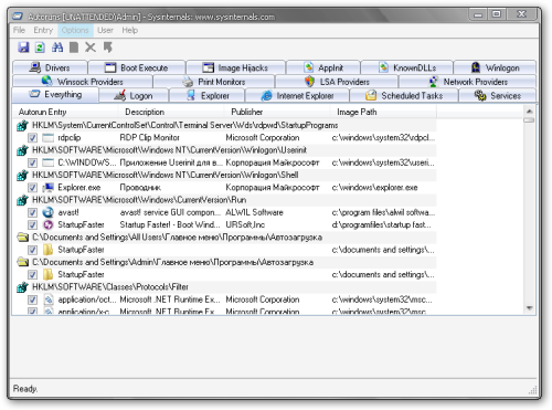 Программка от известного человека под именем Mark Russinovich, именно он в свое время был причиной скандала, когда выявил на дисках компании SonyBMG безобразное творение под названием руткит. И так, Autoruns умеет отображать все загружаемые процессы, модули, библиотеки, стартующие при старте операционной системы. Анализирует ветки реестра, мониторит запуск служб и различных приложений.