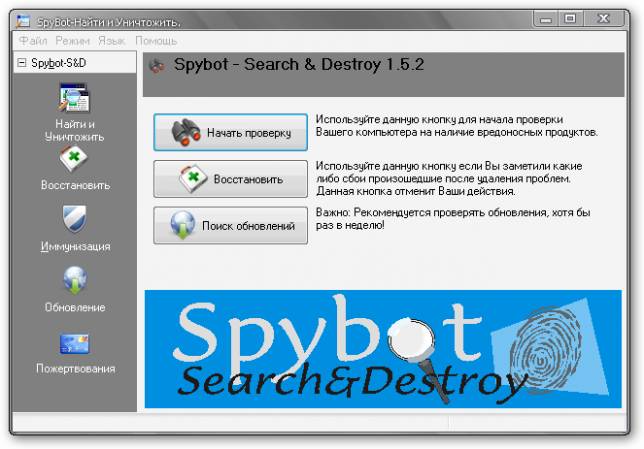 Spybot-Search&Destroy 1.5.2.20 - Программа для обнаружения и удаления из системы "шпионских" модулей, которые время от времени появляются на жестком диске, особенно после установки якобы бесплатных программ. Характерная особенность Spybot-Search&Destroy - в случае, если удаление этого модуля приводит к наработоспособности программы, которой он принадлежит (впрочем, этот модуль на самом деле является совершенно самостоятельной программой), то Spybot-S&D способна подменить его пустышкой, которая, естественно, никаких данных о ваших предпочтениях ни собирать, ни отправлять не будет...