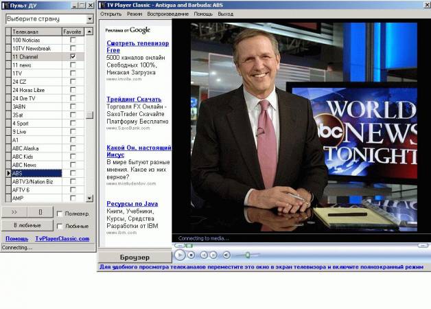 "Программа для просмотра и записи на диск онлайн интернет телевидения со сжатием "на лету" в формат AVI (Xvid, DivX и др.), а так же телеканалов, принимаемых через ТВ тюнер или видеопотока с видеокамеры (если имеются в системе). Программа позволяет вещать собственный канал в Интернет с ТВ тюнера, видеокамеры или другого интернет телеканала. Просмотр более 20-ти платных русскоязычных и 400 международных каналов, включая каналы для взрослых...