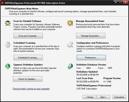 SUPERAntiSpyware – одна из наиболее полноценных программ на рынке, предназначенная для сканирования компьютера на предмет вредоносного ПО. По словам разработчиков, приложение способно находить вредоносные программы, даже если другие сканеры их пропускают. Продукт справляется со шпионским ПО, рекламным ПО, троянами, кейлоггерами, червями и др. Среди возможностей - обработка выборочных дисков, памяти, регистра, отдельных папок. Объекты, не подлежащие лечению, могут помещаться в карантин.