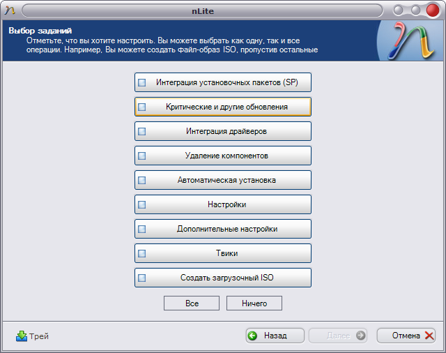 nLite - это программа для работы с дистрибутивами Windows XP, Windows 2000 или Windows 2003. При помощи nLite вы можете интегрировать предварительно загруженные пакеты обновлений (Service Packs) и хотфиксы. nLite предоставляет широкие возможности для "вырезания" из дистрибутива различных компонентов, которые обычно устанавливаются по умолчанию. Это позволяет уменьшить общий объем инсталляционных файлов и сэкономить место на диске после установки системы.