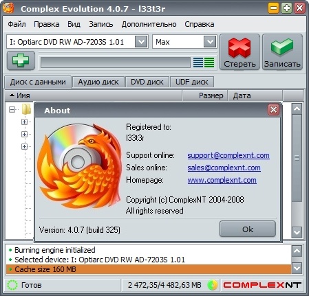 Complex Evolution - это программа для записи всех типов дисков CD/DVD/Blu-Ray/HD-DVD, включая загрузочные и UDF, а также записи образов, включая mds - Alcohol 120%. Ее отличает уникальная легкость в освоении даже для неподготовленного пользователя. Разработчики сознательно отказались от каких-либо второстепенных свойств и сосредоточились на двух основных требованиях - простоте и удобстве использования. Русский интерфейс присутствует !