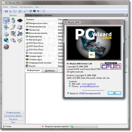 Утилита PC Wizard предоставляет обширную информацию обо всех компонентах, установленных в ваш компьютер. Поддерживаются практически все существующие процессоры, чипсеты, материнские платы, память, устройства для чтения, записи и хранения информации и т.д. Кроме того, в PC Wizard встроено несколько приложений для тестирования быстродействия процессоров, жестких дисков и CD/DVD-приводов. В программе присутствуют опции по предоставлению информации о XP SP2 Center Security (Firewall, Updates, AntiVirus Protection, Remote Ports).