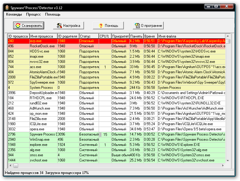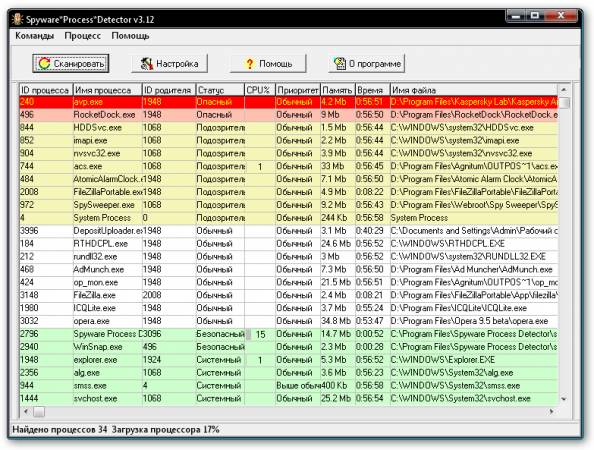 Spyware Process Detector показывает пользователю на экран список запущенных процессов в системе. Обнаруживает любые скрытые процессы, такие как шпионы, трояны и вирусы. Используется 17 методов обнаружения скрытых процессов. Каждый процесс оценивается программой по степени опасности. Опасные и скрытые процессы выделяются красным цветом. Пользователь сам решает удалить этот процесс или оставить его, пометив как "безопасный". Данная программа нужна для определения новых (ещё неизвестных вашей антивирусной программе) вирусов, троянов и шпионов. Рекомендуется использовать вместо стандартного диспетчера задач вместе с вашей антивирусной программой.