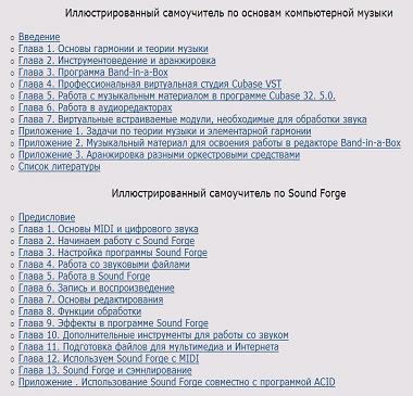 Два самоучителя по основам компьютерной музыки (документация, учебник по созданию музыки на компьютере) и по Sound Forge (документация, учебник Sound Forge).