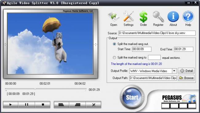 Agile Video Splitter является лучшей в мире программой для разрезания AVI, DivX, Xvid, MPEG-1, MPEG-2, WMV, MP4, MOV файлов. Она все делает за 3 шага: открыть видео, выбрать диапазоны, нажать кнопку старт. Также в нее встроены медиа кодеки и их не надо устанавливать дополнительно.