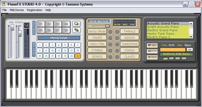 PianoFX Studio 4.0 - программа-синтезатор, превращающий ваш компьютер в мощный синтезатор без использования MIDI-клавиатуры. Вы можете играть на виртуальной клавиатуре с помощью мыши и буквенных клавишь. Программа синтезирует звучание 127 инструментов, имеет drum-машину, может писать ваши произведения в wav или midi формате.