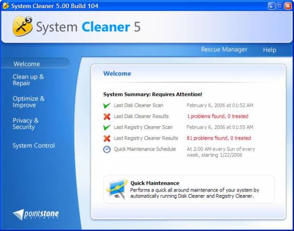 System Cleaner - программа для удаления с жесткого диска ненужных данных - временных и лог-файлов, кукисов и других файлов, находящихся в кэше браузера, и т.п. System Cleaner "понимает" более ста расширений, используемых для обозначения временных файлов, позволяя тем самым автоматизировать процесс очистки жесткого диска от накапаливающегося со временем хлама; с другой стороны, возможен поиск (и удаление) файлов с любыми другими расширениями. Кроме этого, программа допускает удаление неправильных записей из апплета "Установка и удаление программ"