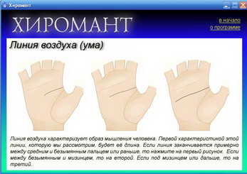 Хиромант - программа для гадания по руке, есть детальное описание с картинками! Просто необходимо сравнивать свою руку с картинкой на экране. Эта программа сможет удивить любого. Всё гениальное просто. Теперь можно погадать друзьям и близким. Програма легка в использовании, не требует установки. Размер - 1,46 мб.