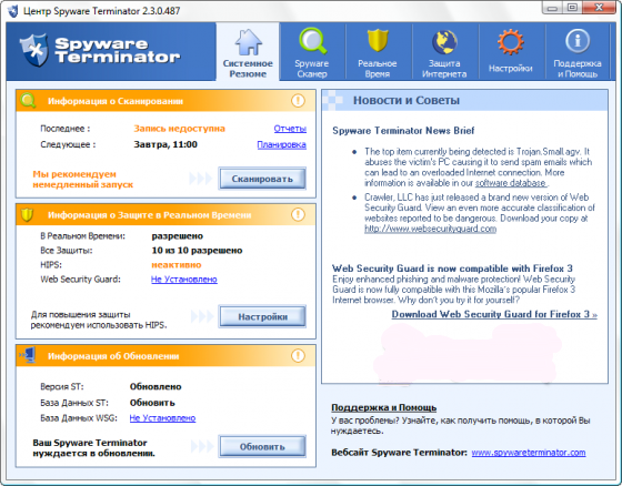 Spyware Terminator - программа для защиты компьютера от различных вредных модулей - spyware, adware, кейлоггеров и других троянов. Имеет резидентный монитор, который в реальном времени проводит мониторинг системы и предотвращает попытки проникновения на компьютер вредоносного ПО. Кроме этого, имеющийся в программе сканер поможет отыскать и поместить в "карантин" или удалить уже внедренные объекты. Работает программа очень быстро... Spyware Terminator имеет опцию автоматического обновления своих баз через Интернет, а также умеет производить проверку по расписанию.