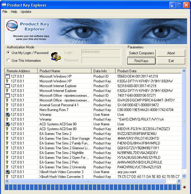 Product Key Explorer - позволяет расшифровать и увидеть, а также сохранить серийные номера (Product ID, Product Key, License Info, User Name, Company) продуктов Microsoft, CD-key установленных на компьютере программ, и не только их. Неполный список ПО, регистрационные данные которых можно увидеть и сохранить: Micrsoft Windows (2000, XP, 2003, Vista), Microsoft Office 2003, Microsoft Office 2007, Microsoft Office XP, Micrsoft Visual Studio 2005, Macromedia, Ahead Nero, Adobe Photoshop, CyberLink PowerDVD, Borland Delphi и т.д. (более 40 продуктов).