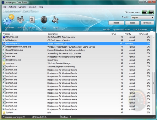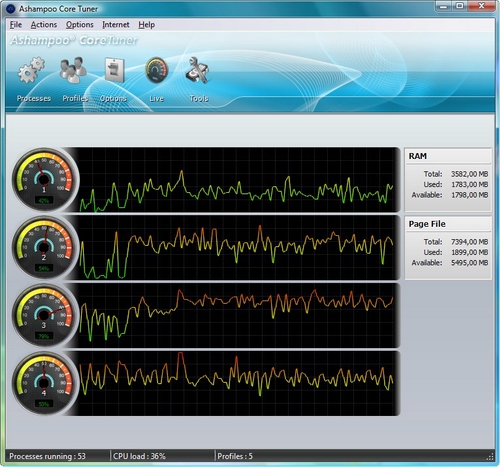 Ashampoo Core Tuner - новая программа от немецкого разработчика, которая позволяет оптимизировать производительность вашего многоядерного процессора. Многие современные компьютеры работают на двухядерных процесссорах, некоторые даже на четырехядерных. К сожалению, Windows не всегда хорошо управляет несколькими ядрами, из-за чего вы не получаете реальную мощность и производительность от купленного процессора. Данная программа позволяет исправить ситуацию, оптимизировав производительность вашего ЦПУ. Для мгновенного результата вы можете нажать на кнопку авто-оптимизации, после чего для всех ваших запущенных программ будет сделана оптимизация, по использованию центрального процессора. Однако, вы также сможете самостоятельно настроить использование процессора для каждой программы по-отдельности. Кроме этого, вы сможете отладить отдельные процессы, просматривать в реальном времени производительность каждого из ядер вашего процессора или повысить общую производительность системы, с помощью дополнительных инструментов, встроенных в программу.