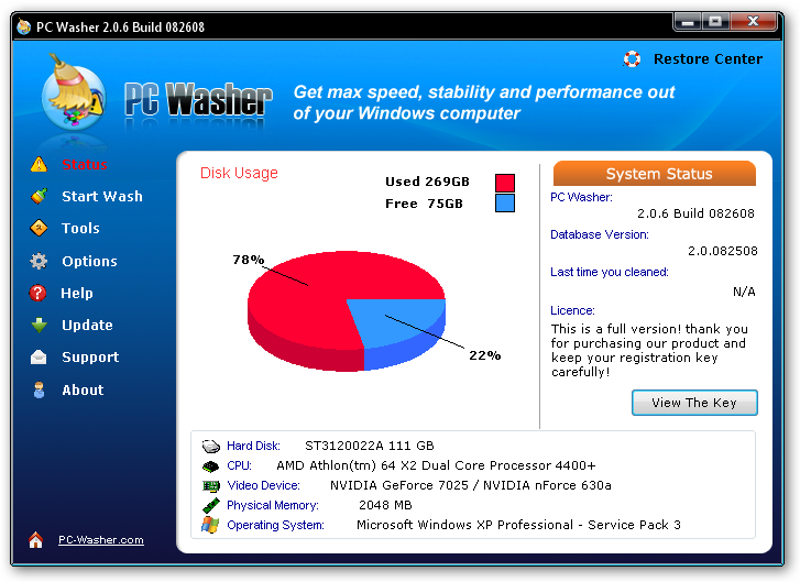 [b]PC Washer[/b] - данная программа просканирует вашу систему и выдаст в процентном отношении ее захламленность для принятия пользователем решения. Программе известно более 80 видов ненужных файлов, которые он готов удалить переместив их в корзину. PC Washer заставит вашу систему стать более устойчивой и работать быстрее, автоматически очищая ее от: временных интернет файлов и файлов оставленных программами; ненужных логов и файлов резервного копирования; пустых (нулевых) файлов; index.dat файлов; битых ярлыков; недействительных записей реестра и т.д.