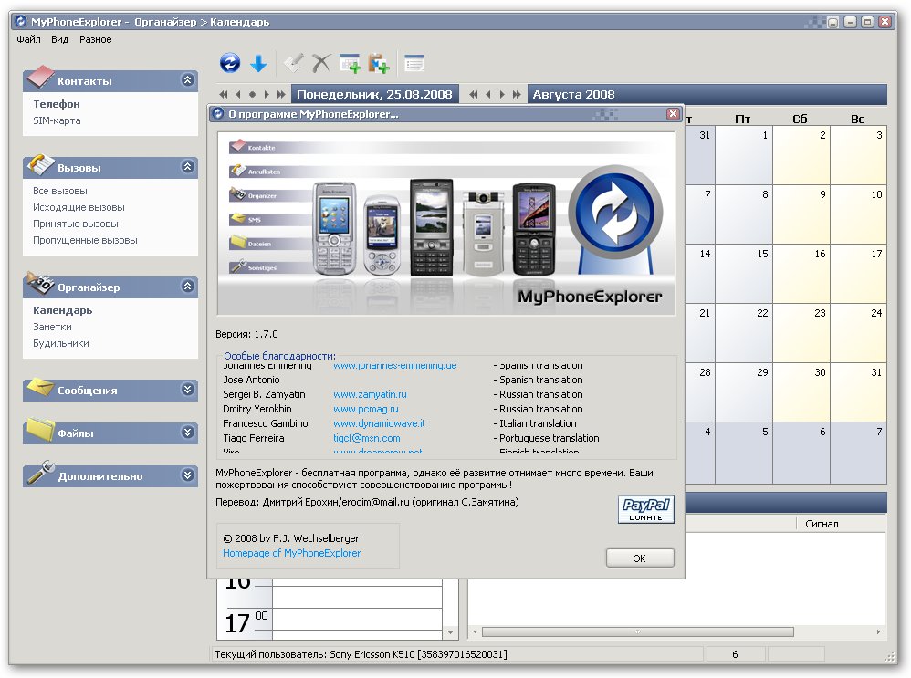 Обновилась MyPhoneExplorer - бесплатная утилита, позволяющая с легкостью управлять содержимым телефонов Sony Ericsson через кабель, bluetooth или инфракрасный порт. Программа предоставит вам возможность работы с адресной книгой, управлять записями в календаре, работать с SMS (создавать копии, экспортировать, импортировать и т.д.), просматривать файлы на телефоне, синхронизировать часы, редактировать профайлы и многое-многое другое. Имеется русский интерфейс.