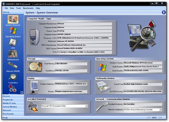 Hardinfo 2008 - пакет программ, предназначенный для диагностики, измерения производительности и вывода информации об аппаратной части и операционной системе как для одиночного компьютера, так и для любого ПК в сети (LAN и интернет). Доступна возможность работы с удаленными компьютерами без установки на последних какого-либо клиентского ПО. Отчеты о результатах обследования формируются в текстовом или HTML-форматах. Программа является наиболее легким в использовании диагностическим инструментом. Также данная программа представляется первым диагностическим приложением, которое поддерживает обнаружение конфигурации оборудования на удаленном сетевом компьютере без необходимости устанавливать какое-либо клиентское ПО на все компьютеры, находящиеся в сети.