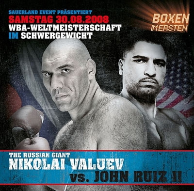 Бой за вакантный титул чемпиона мира по версии WBA в супертяжёлом весе (свыше 90,717 кг) Николай Валуев (Россия) (48-1-0, 34) - Джон Руис (США) (43-7-1, 29) Поздно вечером в субботу в Берлине на арене имени Макса Шмеллинга в Берлине один из самых известных российских боксеров Николай Валуев победил в принципиальном матче-реванше американца Джона Руиза, завоевав временный вакантный титул чемпиона WBA в супертяжелом весе.