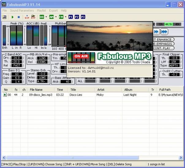 Уникальный небольшой японский звуковой процессор придаст вашим MP3 и WAV файлам потрясающее "студийное" звучание, присущее станциям FМ диапазона. Которое сделано более полно, напористей и агрессивней для того, чтобы музыка прилично звучала даже на самой примитивной звуковой аппаратуре. Fabulous MP3 ”на лету” внесет в вашу музыку искрящиеся высокие и мягкие напористые басы, расширит динамический диапазон и панораму, изменит баланс частот в нужную сторону, уравновесит громкость и пр.
