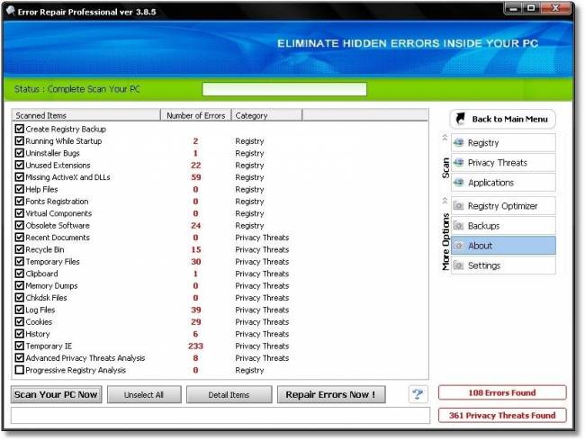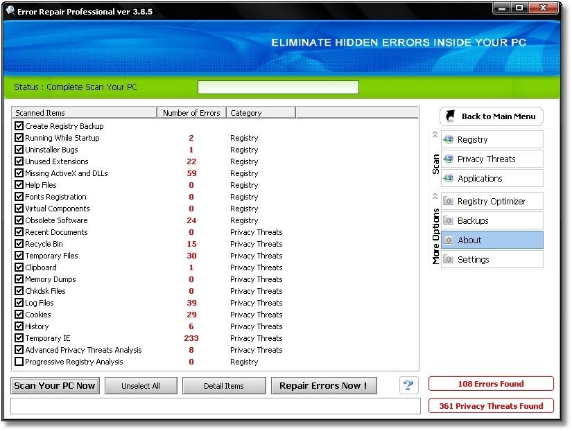 Error Repair Professional. Она найдет неполадки в реестре, библиотеках данных системы и приложений, а также серьезные ошибки, допущенные пользователем, ставящие безопасность системы под угрозу.