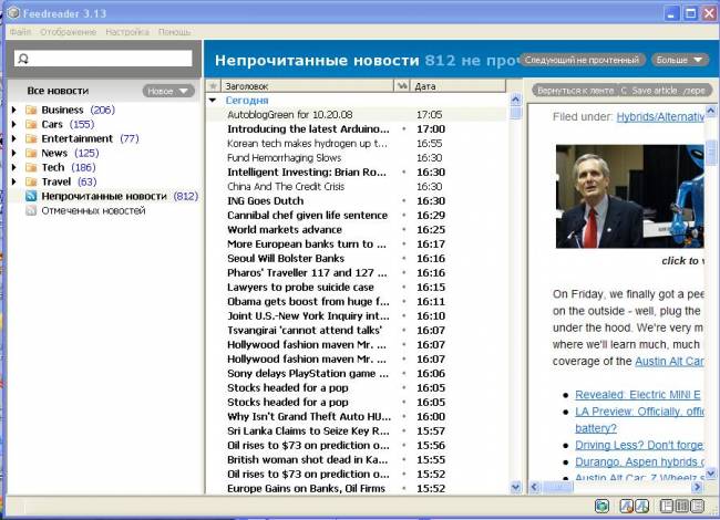 FeedReader 3.13 - Агрегатор новостей - программа для получения новостей с веб-сайтов в форматах RSS и ATOM.В программу "зашито" довольно много новостных лент, разбитых по категориям